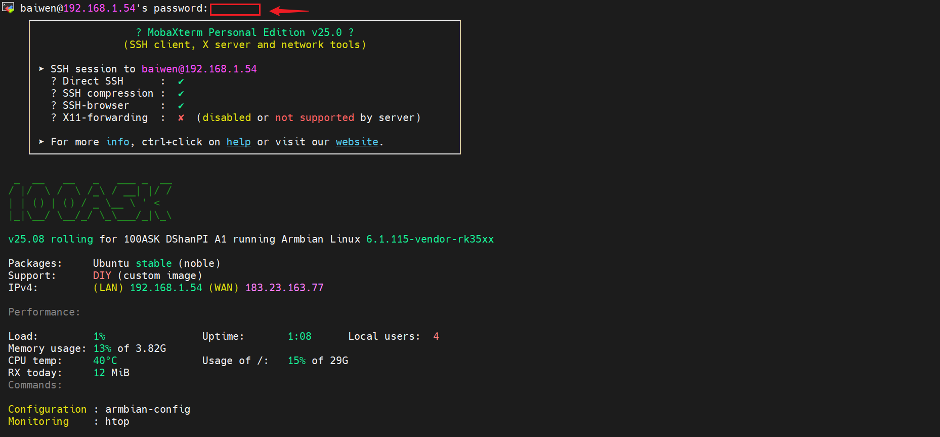 当您看到类似 root@dshanpi-a1:~# 的命令提示符时,说明您已成功登录开发板!